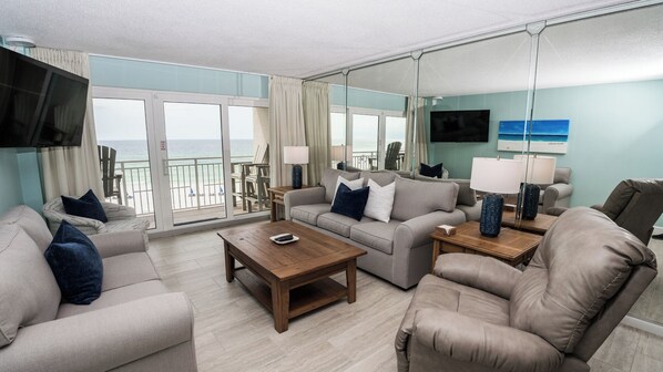 Step into the bright and airy living room, where you'll find a plush queen-size sleeper sofa, a comfy loveseat, a reclining chair, and an HD Smart TV for movie nights or quiet mornings. Large sliding glass doors open to your oversized balcony, perfect for soaking in the sunshine and salty breeze.