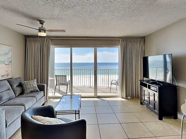 Relax and unwind in the living room, featuring a large flat screen TV, plentiful seating for everyone and a sleeper sofa. You'll find the fully equipped kitchen is ideal for whipping up everything from a quick snack to an elaborate seafood dinner. Enjoy your meal inside at the breakfast bar or head out to the expansive private balcony and dine in the fresh coastal air. Panama City Beach’s famous sunrises and sunsets await!