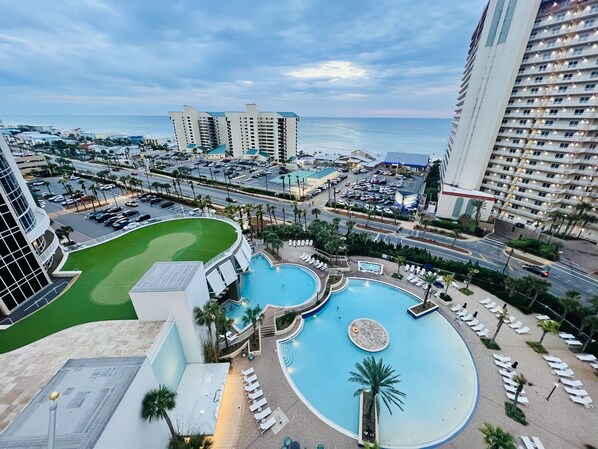 Nestled between a private lake and the Gulf of Mexico, this condo is a great place to be. It resides in the heart of Panama City Beach. The best shopping, entertainment, and dining are all around. Access to five swimming pools, two hot tubs, putting green, fitness room and ocean across the street. There is the Wharf Seafood Buffet, the Candy Maker ice cream/candy store, Salon, Juan Taco, Lu Lu's sports bar, and 810 Billiards & Bowlling.