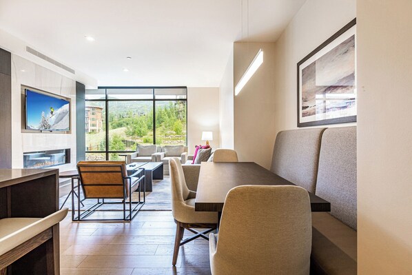 LIVING AREA Step into the spacious living area of this LIFT condo and immerse yourself in luxury. With nine-foot ceilings and full-length windows offering panoramic views of the slopes, this is where comfort meets elegance. Sink into plush seating by the warm glow of the wide gas fireplace, a perfect spot to unwind after a day on the mountain. The living area also features a sleeper sofa, providing extra sleeping space for guests.