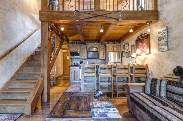 The open loft bedroom features a plush queen bed for restful nights, while a sofa bed by the fireplace provides a cozy spot for snowy evenings. The rustic interior, complemented by a private patio, creates a warm atmosphere ideal for enjoying mountain air with coffee or wine. The fully equipped kitchen includes a wine fridge, full-size oven, microwave, and dishwasher, with bar seating for four for casual dining.