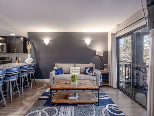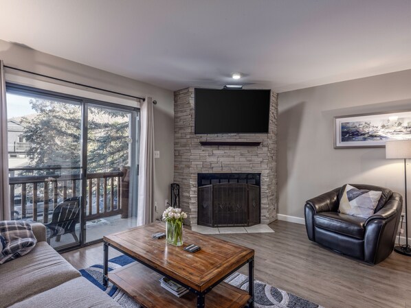 Vardagsrummet är rymligt och möblerat med kvalitetsmöbler som omger en varm sten spis. Luta dig tillbaka och njut av dina favorit-TV-program på 50-tums LED Smart TV. Håll kontakten med höghastighetsinternet också.
