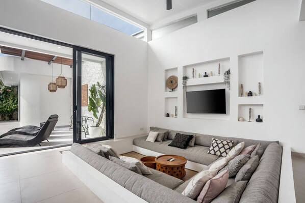 Step into vacation mode at this stunning private villa. Modern elegance and boho charm await, with sun-kissed sliding doors and a cozy living room you'll adore. The kitchen is perfect for tasty meals and belly laughs with your crew.