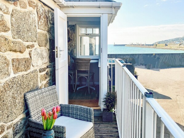 The property is spread over two floors; the living area is on the first floor making the most of the stunning views of the harbour. This cosy room has a feature granite wall leading to a bay window with access to the private balcony. There is a new modern well-equipped kitchen which has everything you would require if you don’t want to eat out all the time. Sit here for morning coffee or an evening drink and watch the world go by - the night skies here are outstanding. Downstairs on the ground floor is a large bedroom with en-suite facilities; upstairs is a second large bedroom and an amazing bathroom with a freestanding bath.
