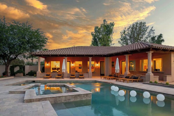 Serenity Scottsdale is as advertised! The outdoor area is fantastic with pool, hot tub, courts, etc. Great outdoor table for large group meals. Tons of room inside, great workout room, two kitchens, etc. The house is on a quiet street with golf course views. As great as everything was, the best part is the responsiveness of the owners/managers - outstanding! Highly recommended!!