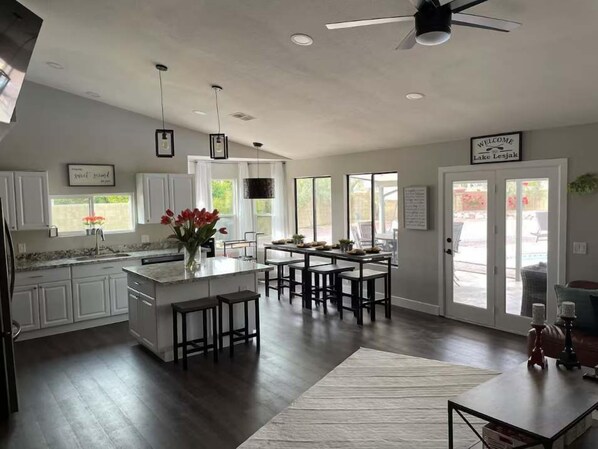 The heart of the home is the open and welcoming living space, where guests can relax, connect, and unwind after a day of exploring Arizona. The fully equipped kitchen includes everything you need to prepare meals, whether it’s a quick breakfast, family dinner, or snacks for poolside lounging. Enjoy meals indoors or step outside to the private pool area and charming patio, perfect for soaking up the sun, dining al fresco, or enjoying quiet evenings under the Arizona sky.