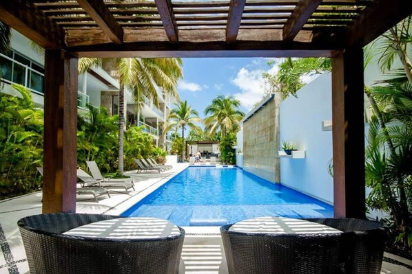 Oasis in Playa is a large 2 bedroom, 2 bath condo with a great view and secluded balcony. It's ideal for families and friends who value privacy and tranquility. You will stay on the 3rd floor of a boutique building in the heart of Playa del Carmen. You will have 24 hour security, a 60 foot heated saltwater pool, gym, outdoor lounge with BBQ and secure underground parking.