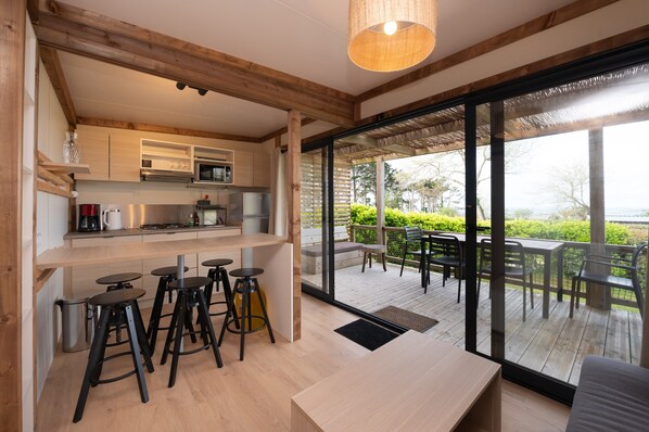 Located in Plouhinec at the Le Loup Blanc campsite, this 35 m² chalet accommodates up to 6 guests in 3 bedrooms. The first bedroom has a double bed (160x200), while the other two each have 2 single beds (80x200), with one elevated bed in the third room. There is space for a baby cot in the third bedroom, and a sofa bed in the living room. The private kitchen is equipped with a 4-burner gas stove, extractor hood with lighting, sink, fridge-freezer, microwave, coffee maker, kettle, and toaster. The chalet features a bathroom with shower cabin, separate toilet, and electric heating in every room.