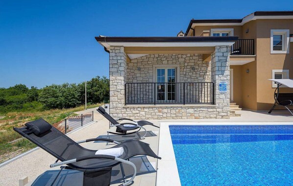 Villan ligger på en liten kulle och har en underbar panoramautsikt över det vackra istriska landskapet och Adriatiska havet. Den rymliga villan har 4 sovrum och kan rymma upp till 8 personer på 165 m² bostadsyta. Villan är helt luftkonditionerad. På bottenvåningen hittar du det fullt utrustade köket, den härliga matplatsen och det rymliga vardagsrummet. På bottenvåningen finns 2 sovrum, vart och ett med eget badrum. På första våningen finns ytterligare 2 sovrum som delar ett badrum. Ett av sovrummen har egen balkong med fantastisk panoramautsikt över havet. I utomhusområdet med panoramautsikt över havet finns en 8x4 meter stor pool (1,40 m djup, 32 m²), utomhusdusch, solstolar, trädgårdsmöbler, grill, gräsmatta med volleybollnät, studsmatta, gunga och ett bordtennisbord. Rökning är förbjuden i hela huset. Huset hyrs inte ut till grupper av ungdomar. Observera att detta boende kan ta emot ungdomsgrupper på begäran. Vänligen kontakta oss för att kontrollera detta. En ungdomsgrupp på detta boende består av personer som är 26 år eller yngre. Om du är en ungdomsgrupp [eller planerar en svensexa] kan du bli ombedd att betala en extra deposition vid ankomsten. Eventuella belopp som krävs för att reparera skador på boendet kommer att dras av från depositionen.