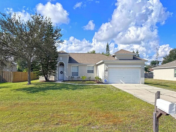 Outdoor space is a highlight of this home, featuring a covered patio that overlooks a large yard fenced along the left and rear sides, offering both privacy and room to relax. An attached enclosed garage provides added convenience, along with central air conditioning and high-speed Wi-Fi throughout the home. With its spacious layout, comfortable furnishings, and excellent location near the Treasure Coast’s beaches and attractions, this home is an ideal base for a relaxing and enjoyable stay in Port St. Lucie.