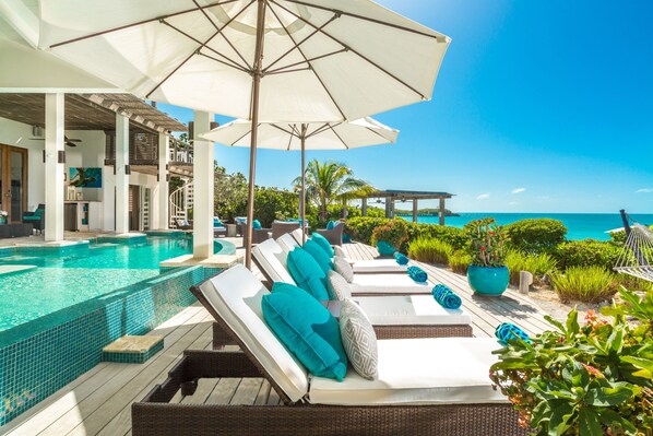 Pool och strand: En böjd kant av 50 fot lång pool är en riktig arkitektonisk funktion och ligger mellan villan och stranden. Det finns en grunt del av poolen perfekt för vading eller små barn, och en djupare del för vuxna. En del av poolen är också täckt för att ge skugga, och en vattenfunktion i ena änden av poolen skapar en naturlig lugnande rytm.