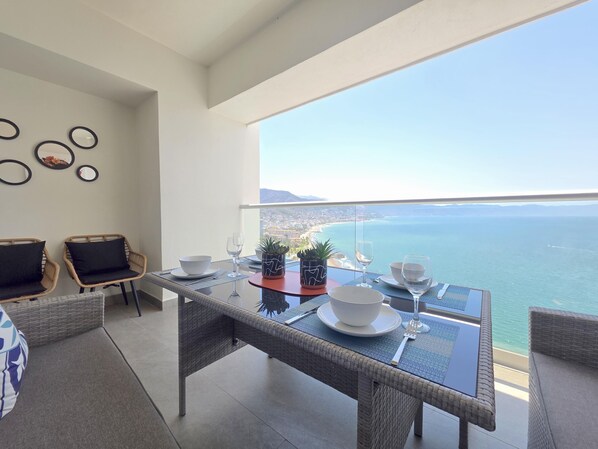 Situated on the 18th floor, the expansive balcony provides breathtaking views of the bay and ocean. With ample seating, it’s the perfect spot for enjoying meals, sipping drinks, or simply unwinding while soaking in the fresh ocean breeze.
