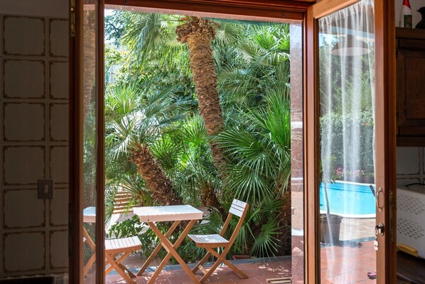 Den lägenhet i villa är 100 kvadratmeter, bottenvåningen omgiven av en vacker trädgård med gräsmatta och ökade trädgårdar, tillgängliga för gäster för exklusiv användning av utomhuspoolen.