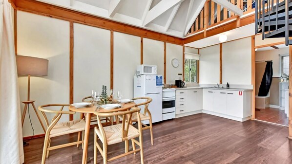 Cathedral ceilings lead to the loft bedroom at the top of the spiral staircase for your romantic holiday. The downstairs bedroom fitted with clean crisp linen on a Queen bed allows easy access. A jet spa tub for two. Enjoy a stroll in the vines or watch kangaroos nibbling grass at dusk.