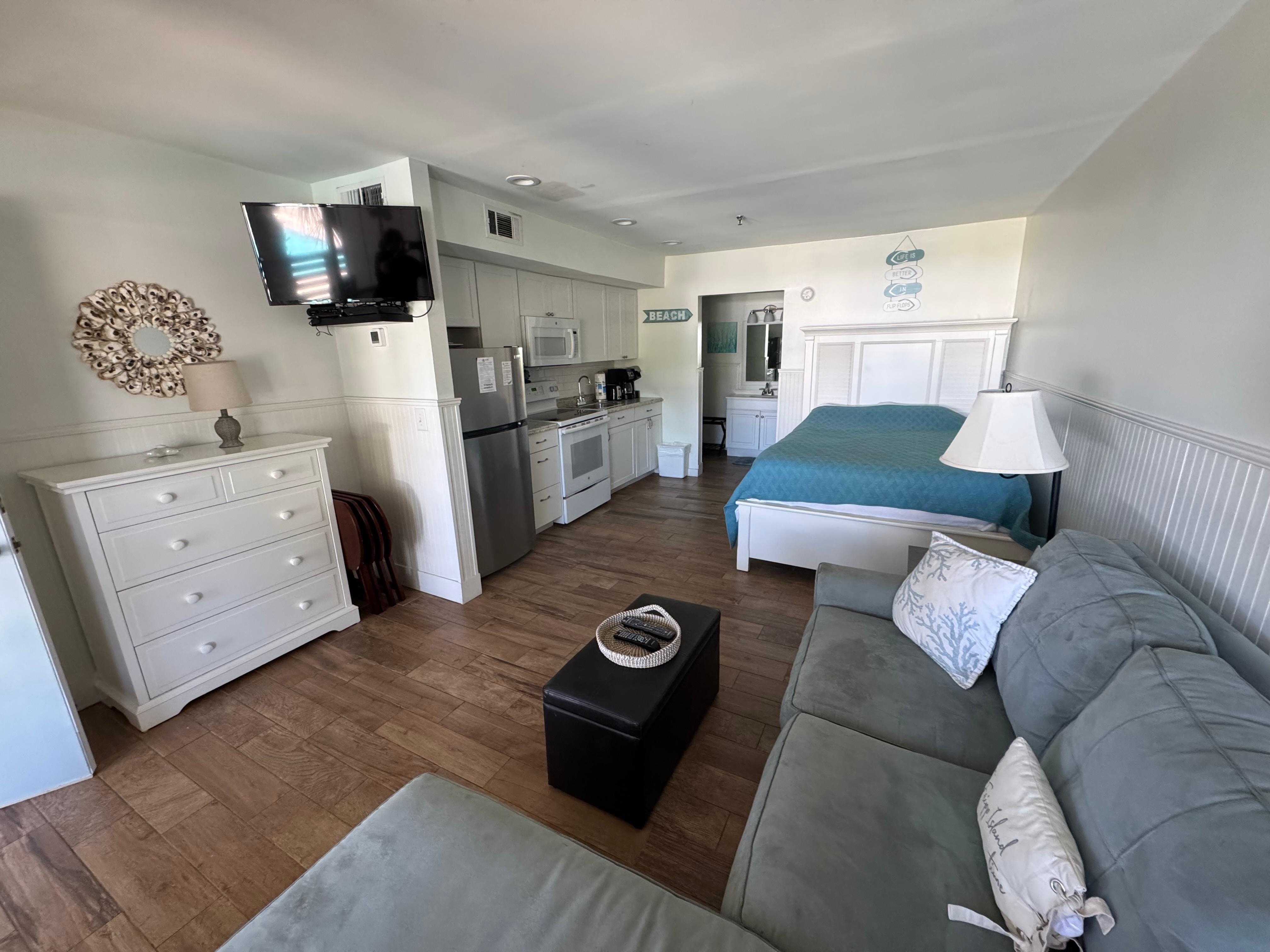 This unit includes a queen bed and queen sleeper sofa, a fully equipped kitchenette with a fridge, oven, microwave, and Keurig and drip coffee maker. There is a full bathroom with a shower/tub combo and a separate vanity area. Smart TV with Hargray cable live TV and high-speed wireless internet. Down the hall is a separate shared laundry area with washers and dryers. Daily rentals available year-round!