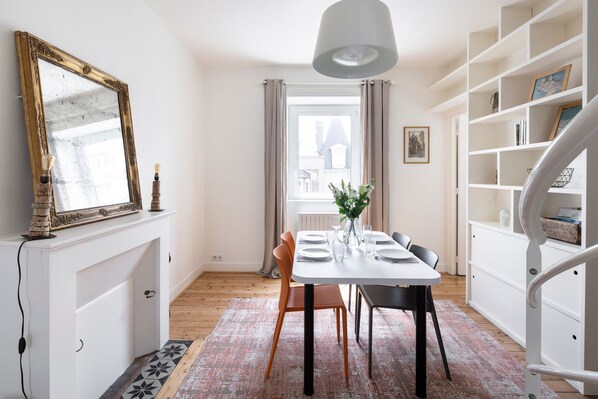 Beläget i ett lugnt gammalt hus och säkert, består det av en entré, ett omklädningsrum, ett ljust vardagsrum. Köket är fullt utrustat och utrustat med diskmaskin, ugn, induktionshäll, mikrovågsugn, brödrost, vattenkokare och Nespresso kaffemaskin. L��genheten har ett sovrum med dubbelsäng och övervåningen en sovplats med två enkelsängar som kan monteras. Det finns också en sittgrupp med skrivbord (velux med utsikt över havet).