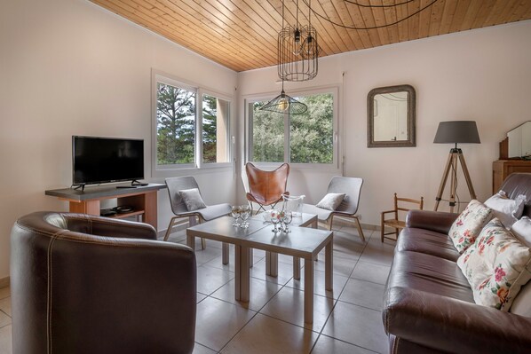 Being of "Nantes" type means that the living areas are upstairs, which still allows, despite the pine trees and trees, to enjoy a small sea view.