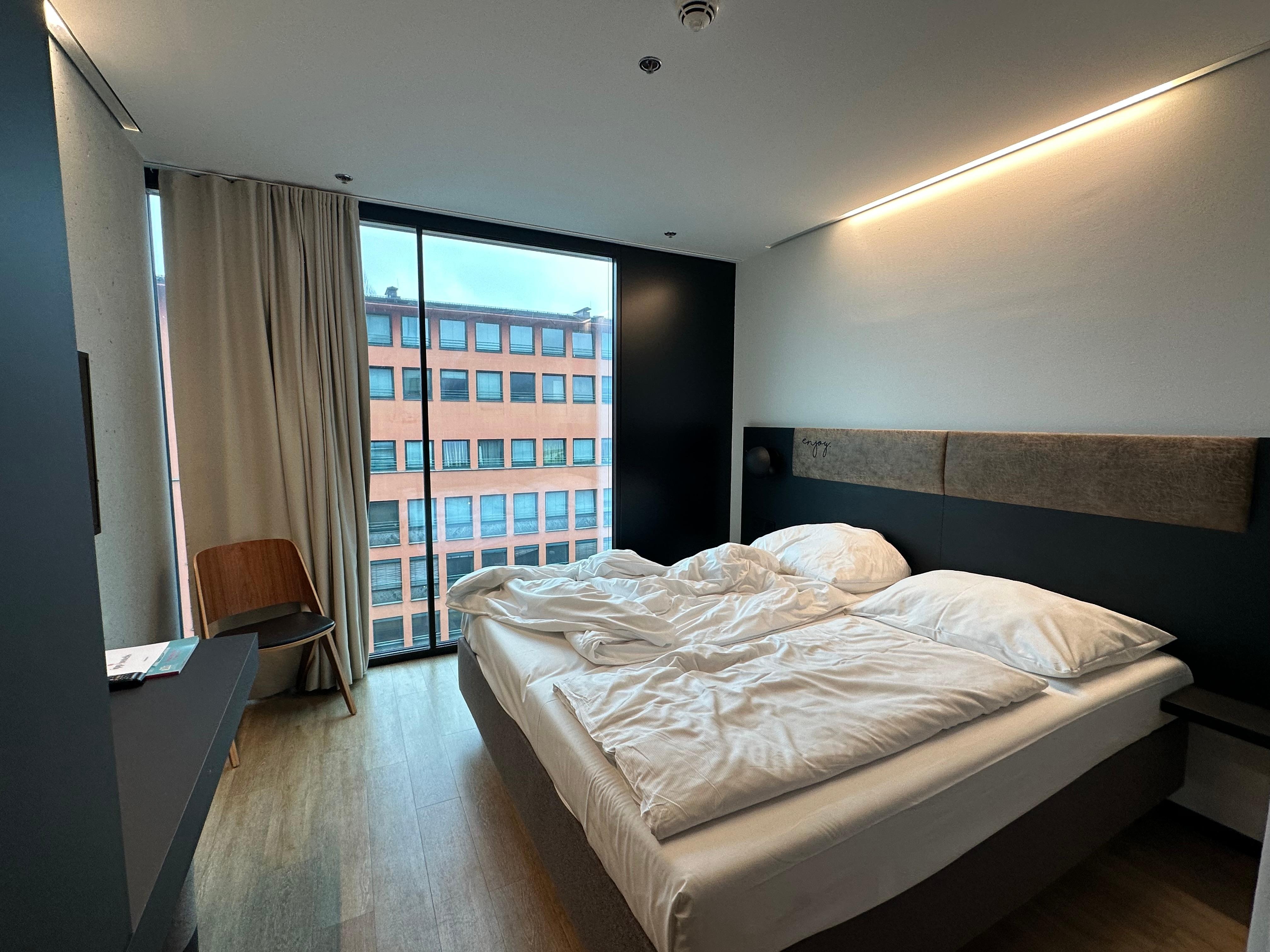 Mycket fint och modernt hotell. Familjerummet var stort och hade fin utsikt över tågspåren. Rummen hade fönster från golv till tak men även bra möjlighet att stänga ute solen. Duschen fanns mitt i rummet och hade ingen dörr, vilket inte passar alla. Städningen kunde ha varit bättre. Dammigt på flera ställen i rummet.