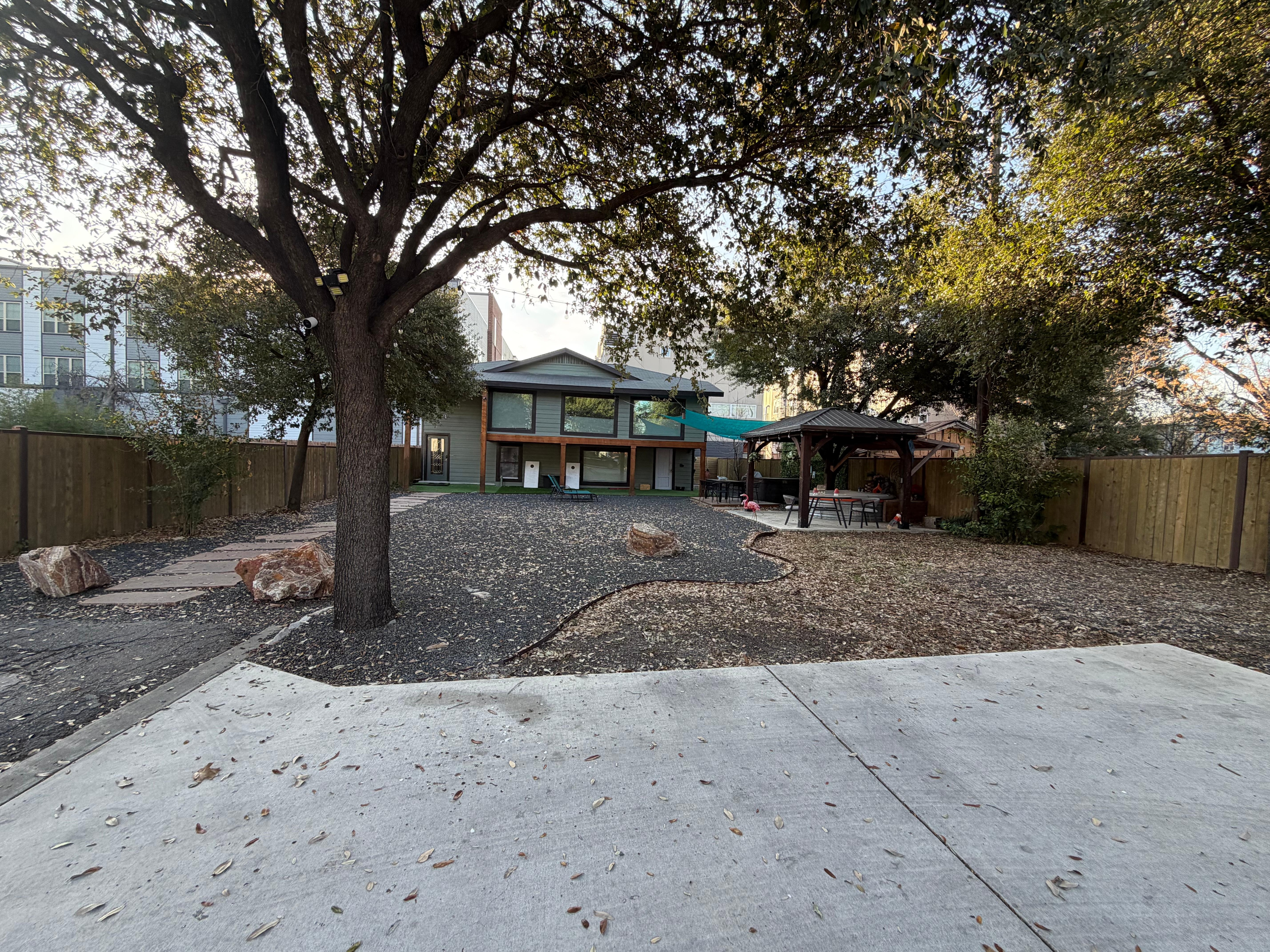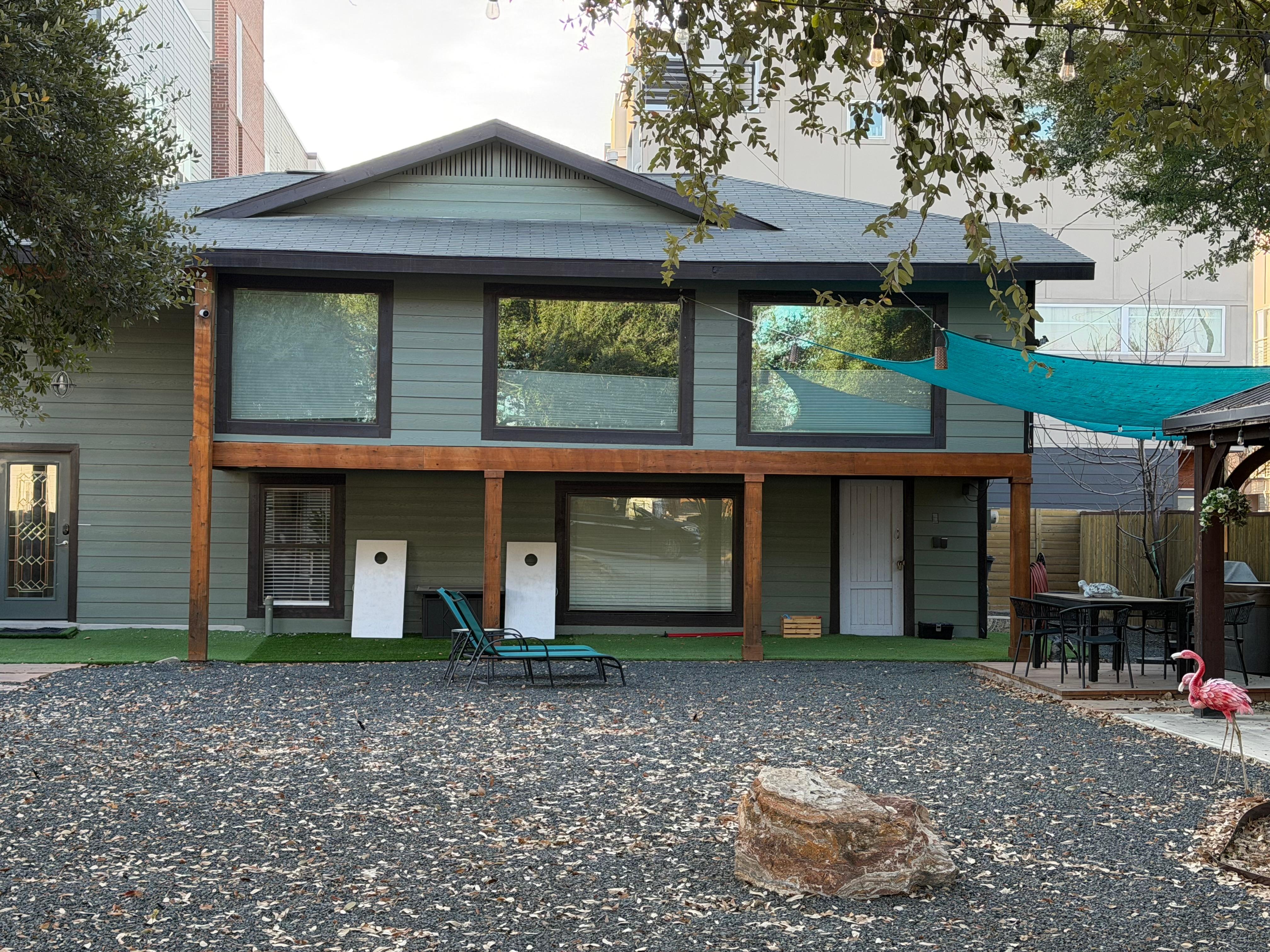 Our home is set towards the back of a 10,000sf lot, offering a unique and spacious front yard for outdoor activities with a gazebo, hot tub, stringed lights, gas grill, fire pit, stock tank cowboy pool, cornhole game, dining table & seating... The property includes 3 to 4 gated parking spaces, ensuring both convenience and a secure, private feel.