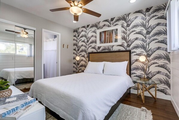 Welcome to our newly remodeled beach home with a premier location just steps to the white sandy swim friendly bay & across the street from ocean in beautiful North Mission Beach. This 2nd level unit is located in a 3-unit property on a desirable corner lot with an exterior beachy mural designed by a local artist. Features include 1br + 1ba, sleeps 2, 50” SMART TV with cable, & dog friendly (unfortunately no cats). NO PARKING included with this unit (see “parking” section below). *Note no A/C in this home, fans are provided.