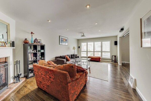 I vardagsrummet har du en väldigt stor soffa, stol och bönpåse för att njuta av vår projektor och Apple TV. Observera att vi inte har kabel, men att ansluta till Wi-Fi gör att du enkelt kan strömma allt från en Apple-dator eller en mobil enhet.
