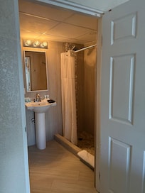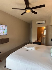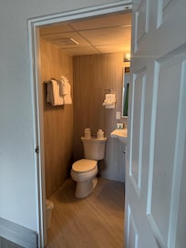 Shower had low water pressure but maintenance fixed that right up. There was no closet, just a rod with hangers and a safe on a pedestal. There was a small fridge, two place settings worth of utensils, coffee pot, etc.