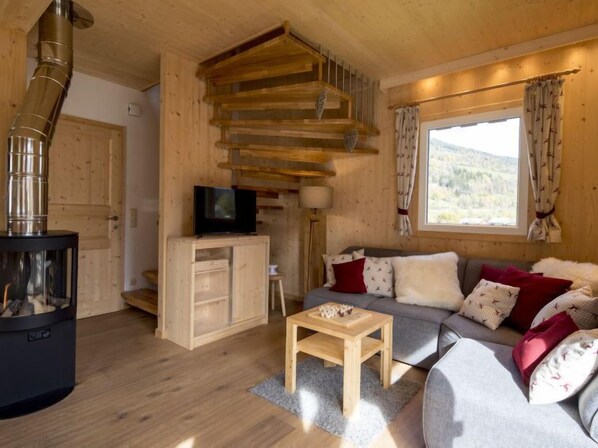"Chalet mit 2 Schlafzimmern & IR-Sauna", 3-rums-chalet 70 m2 med 2 våningar. Ljus, komfortabelt och med mycket trä inrett: ingång. Vardags-/matrum med matbord och sat-TV (flatscreen TV). 2 dubbelrum. Öppet kök (ugn, diskmaskin, 4 kokplattor - glaskeramikhäll, mikrovågsugn, elektrisk kaffemaskin). Dusch/toalett, massage-dusch, Bastu. Balkong, terrass. Mycket vacker utsikt på bergen, skidbackarna och landskapet. Till förfogande: Internet (Trådlös LAN [WLAN] , gratis). Notera: rökfritt hus. Brandvarnare. Hyresobjektet är en boendetyp. Stugorna är individuellt inredda. Utrustningen i bastun kan därför skilja sig mellan en infraröd bastu och en finsk bastu.