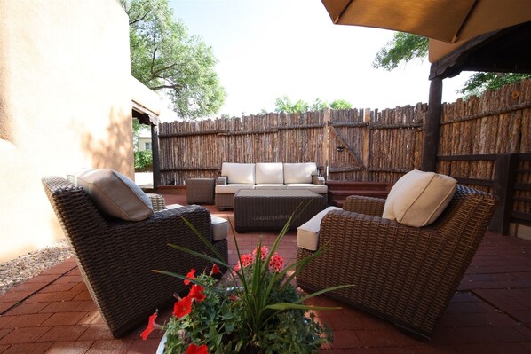 This historic two-bedroom vacation rental has been completely renovated from the floorboards to the roof with modern amenities and keeping the historic details. It is perfectly situated on Delgado Street, just three blocks from the Plaza, and just one from Canyon Road where you will be immersed in some of the finest galleries of artwork in the entire country, allowing you to enjoy the best of Santa Fe with ease. King beds, comfortable living room with a working gas fireplace, large bathrooms, fully equipped kitchen with a breakfast area. Full A/C, WiFi, off-street parking, three flat-screen Smart TVs (Netflix, Hulu, and Amazon Prime), stainless steel appliances, and many other amenities complete this wonderful downtown casita hideaway!
