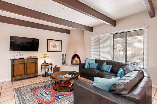Unwind in the inviting living room adorned with an authentic kiva stove, where the ambiance of a wood-burning fire sets the stage for cozy evenings. Immerse yourself in the rich cultural tapestry of Santa Fe, surrounded by tasteful touches such as painted tiles and exposed rafters that pay homage to the city's historical and artistic legacy.