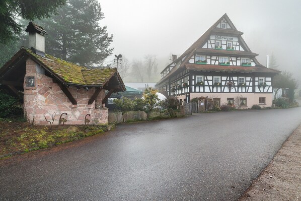 The Linde holiday apartment in Sasbachwalden offers 29 m² of space for up to 3 guests. It features 1 bedroom and 1 bathroom. This studio apartment is located in a listed building with clay-straw walls and solid wood furniture. Please note: under the ceiling beams, the height is partly only 1.80 m. The private kitchenette includes a 2-burner stove, a fridge with freezer compartment, and a sink. Wi-Fi is available. Breakfast can be arranged on request for an additional fee.