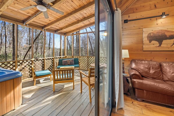 Outside the sliding glass doors in the living room is a large screened porch with outdoor furniture for lounging and dining. The hot tub is ready and waiting for you to relax and enjoy.
