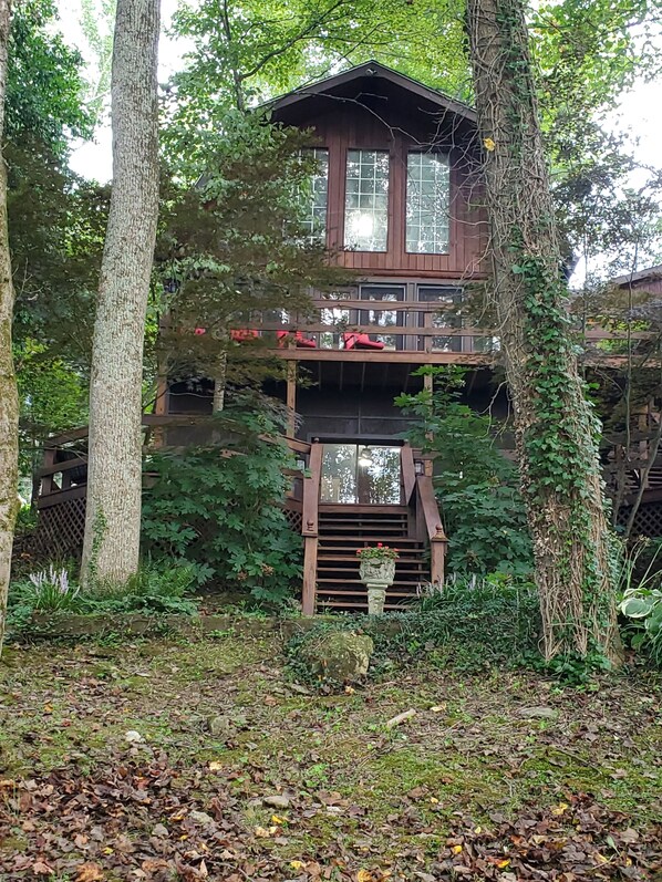 Beautiful log cabin on Barren River Lake on a wooded lot . Walk down to lake or sit on decks and relax . Has large vaulted ceiling in living room . It has 3 levels . Top level has two bedrooms and a half bath . One of bedroom has a private deck to look out at water . Main floor has kitchen , dining and living room and full bath with custom tile shower . Bottom floor has two bedrooms , laundry area and a den area . Deck has two levels to view lake from . Back yard has stone path to water feature . There is steps going down to back yard that lead to Lake . Comes with a Blackstone grill on deck . Large 75" Sony smart tv on main floor in living room and a large sectional couch . Downstairs den has a 42" smart tv . Electric fireplace on main floor . Kitchen comes fully stocked with dishes , cups , baking sheets and silverware and pots and pans . Pantry has paper goods and seasonings . Kitchen has electric stove , microwave , coffe maker and blender . Electronic door lock . Security lights on exterior . Propane Firepit on lower deck . Wood firepit in back yard . Stairs are narrow and kind of steep so please be careful