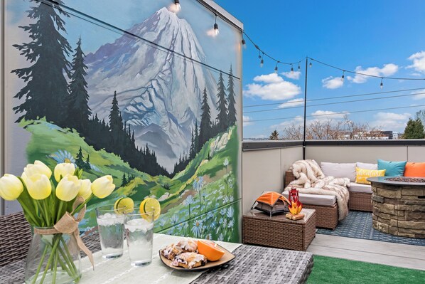 Rooftop Deck: ✦Outdoor Seating ✦Propane Fire pit ✦Hot Tub ✦Ice Chest