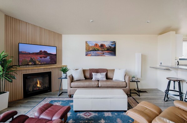 Relax in the inviting living room with a smart TV, where you can log into your favorite streaming services. The sofa is a pull-out bed that can sleep two guests.