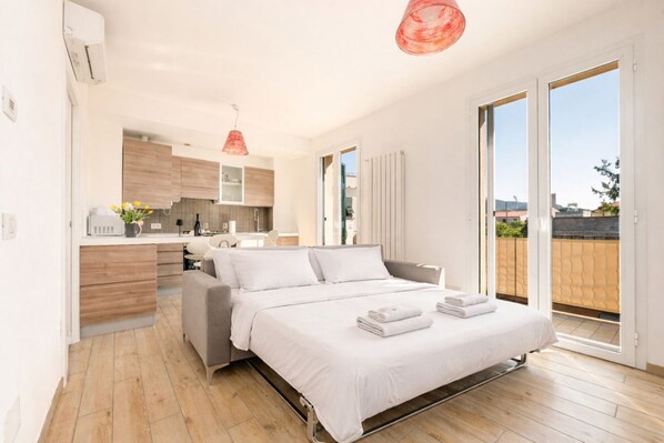 The open-plan living area is the heart of the home: a fully equipped kitchen and living space come together in a functional and welcoming environment, perfect after a day at the beach, hiking or exploring Ligurian villages. The sofa bed allows accommodation for up to 4 guests, making the apartment ideal for couples, families or small groups.