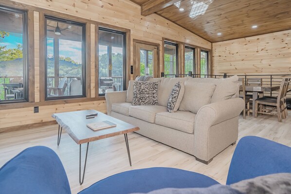 Treat your family to a private pool with a beautiful view of the Smokies! Float, splash, and play in this indoor pool surrounded by windows. One end of the pool room is a garage-door-style window that slides up onto the ceiling, giving you wide-open, unobstructed views from the water.