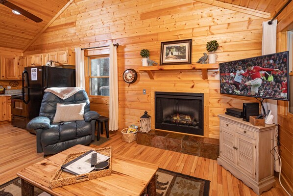Denna charmiga ett sovrum stuga är helt handikapp tillgängligt! Sovrummet har en king size-säng och platt-TV. Badrummet har grepp barer runt toalett och stor dusch med en liten 2 tums läpp och gripbarer. Det finns en duschramp i hytten om du behöver kunna rulla in. En duschstol kan också tillhandahållas om det behövs. Vardagsrummet har en elektrisk spis, platt-TV och bäddsoffa för barn. Köket är fullt utrustat med allt du behöver för att laga mat. Den privata bakdäck har gungstolar, en badtunna och en kolgrill.