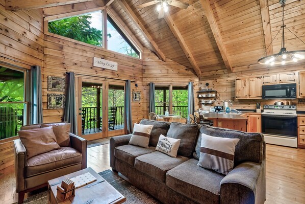 Cozy Bear cabin is a one-story that will comfortably accommodate a couple looking for a romantic getaway or a family of four. Once you enter the front door, you will instantly feel relaxed with the expansive view of trees through the many windows!