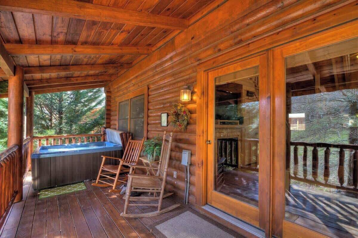 The covered deck offers an outdoor hot tub and rocking chairs. Kick back with a glass of wine and enjoy this amazing view. There is no better place youâll want to be during a sunset! đ . In the summer months you can end your day with a fantastic view of the Dollywood fireworks display. đ đ