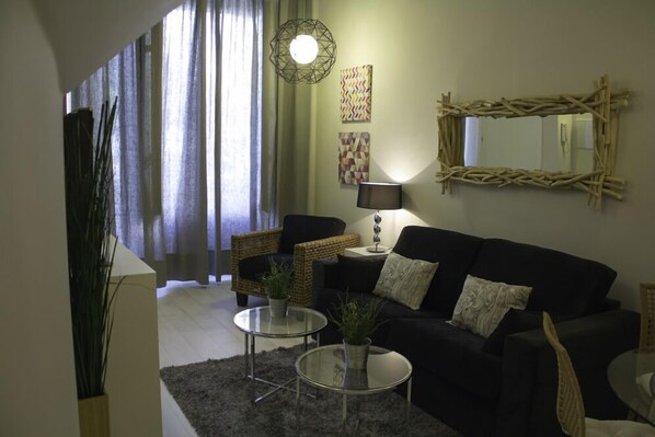 Nytt, original och centrum loft lägenhet, vackert inredda för att bygga S. XIX helt rehabiliteras. Behåller arkitektoniska element av värde (träbalkar, tegel pelare, etc.) består av vardagsrum, 2 sovrum, kök och badrum. Downtown, nära till allt. Mycket välkomna. WiFi.