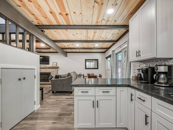 This two-story cabin has been completely renovated and has a mountain modern feel. Inside you will find 2 bedrooms, 2 bathrooms, a loft area that provides a additional sleeping, and a pull out couch. The open concept living room, dining room, and kitchen comes complete with rich wood floors and beautiful countertops. You will enjoy relaxing in front of the gas fireplace which includes a brick surround and wood mantle. The cook in the family will appreciate the modern shaker style cabinets and fully-equipped kitchen for cooking a meal or baking some warm chocolate chip cookies. Get cozy with some coco and watch your favorite movie on the flat-screen TV. Wake up with a warm cup of joe in hand (complimentary selection of coffee and hot cocoa are offered).