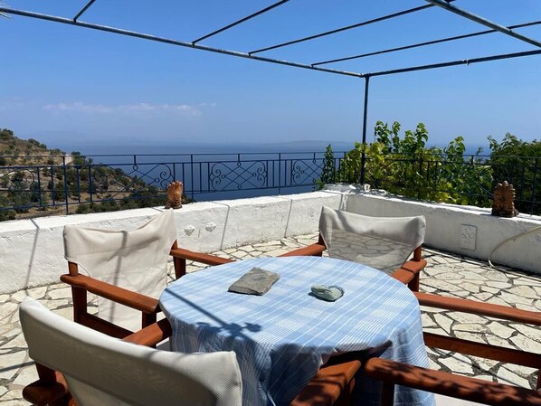 L’une de ses deux terrasses laisse découvrir un paysage superbe sur la mer toute proche (3 Kms) et les plantations d’oliviers alentours, l’autre, ombragée, est idéale pour les petits déjeuners. La petite piscine - dont une vraie maintenance du système de filtrage s’impose - s’est maintenue totalement dans l’ombre en ce mois de septembre, mais du coup, nous a offert une possibilité de rafraîchissement bien appréciée. L’intérieur de la maison, dans son ameublement et sur ses trois niveaux, a beaucoup de charme. L’on s’y sent très vite à l’aise et…un petit peu de l’autre côté du « chanel ». Le tout est réalisé avec goût. Divers équipements (notamment les ustensiles de cuisine et la literie) mériteraient d’être sérieusement rafraîchis. Les bricoleurs seront les bienvenus (achats et remplacements d’ampoules électriques, tuyau de douche, détartrages divers, etc.). Pas de wifi, et si nécessité, prévoir l’achat de cartes « datas » à l’aéroport. Prévoir également un matériel adéquat pour combattre les moustiques bien présents et agressifs dès la tombée de la nuit.