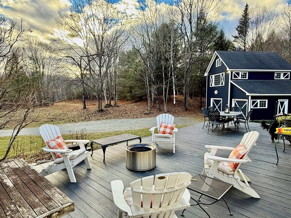 Located in So. Londonderry minutes to Stratton, Bromley & Magic, come enjoy this updated 4+ bedroom country home set on 6 pristine acres close to all area attractions, shopping & restaurants. Located down a private road, there is plenty of parking and space to play... hike, snowshoe and sledding for the little kiddies. An oversized Deck looks over the property. Gather around on a snowy night in the cushioned Adirondack chairs with a fire in the Solo stove, roast marshmallows, grill on the new Weber grill, dine at the wrought iron table, or enjoy your morning coffee while taking in the view or watch the many stars. The gorgeous bedrooms include a Master king bedroom, two queen bedrooms, and a full bedroom, and an additional sleeping loft with 4 twin bunks, providing plenty of space for families & guests with warm and comfy bedding. Two living rooms each feature fireplaces, the first opens to a warm cook's country kitchen & dining area with wide pine plank floors, butcher block counters and all new GE appliances, wine fridge & microwave. Lots of China & wineglasses & glassware. We are stocked with all cooking & entertaining needs including baking pans, fondue & stewpots. Throw anywhere from a formal dinner to easy pizza nights with your guests. This is a perfect entertaining home. The pine lined family room features cathedral ceilings and a large stone fireplace & oversized smart TV, with additional space to lounge. A peloton to warm up those legs & workspace make work from home or homework a breeze. An inviting library has a large partner's desk looking out over serene, wooded views from the bay window and fireplace, printer, two monitors, board games & large collection of books. A great private area for work from home, conference & zoom calls. Stay comfortable year-round with heating and air conditioning. This amazing home invites families and guests to unwind and create lasting memories. We look forward to welcoming you to our place.