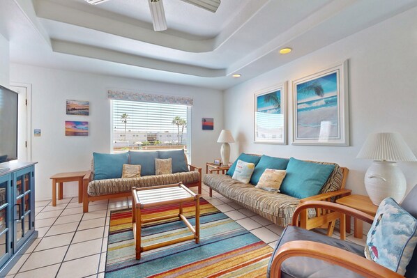 Cool tile floors, coastal artwork, and tons of natural light bring an easy-breezy feel to this rental. In the evenings, kick back in front of the 55” wall-mounted TV in the living area, which also has a pair of futons with full-size mattresses—perfect if you need extra sleeping space.