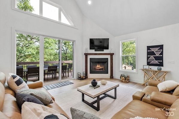 Inside, you'll find a luxurious leather sectional couch in the main living room, complete with charging outlets, a flat charging station and 3 recliners to relax and kick up your feet by the wood burning fireplace or watch a movie. With two separate living areas, there's ample space for the whole family to spread out and enjoy their own activities. This lakeside retreat truly has it all, offering a tranquil escape with all the modern comforts you could desire. With sleeping accommodations for 14+, it's the perfect destination for a memorable family vacation or a gathering with friends. Book your stay with us today and experience the ultimate relaxing getaway!