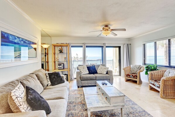 Inside, the condo is beautifully decorated with tropical décor and offers plenty of space to unwind. The well-equipped kitchen is stocked with dishes, utensils, cookware, and updated stainless steel appliances, making it easy to prepare meals at home. Enjoy dining at the table or extra seating at the kitchen counter. The private balcony off the living room is the perfect spot to relax and soak in the coastal scenery.