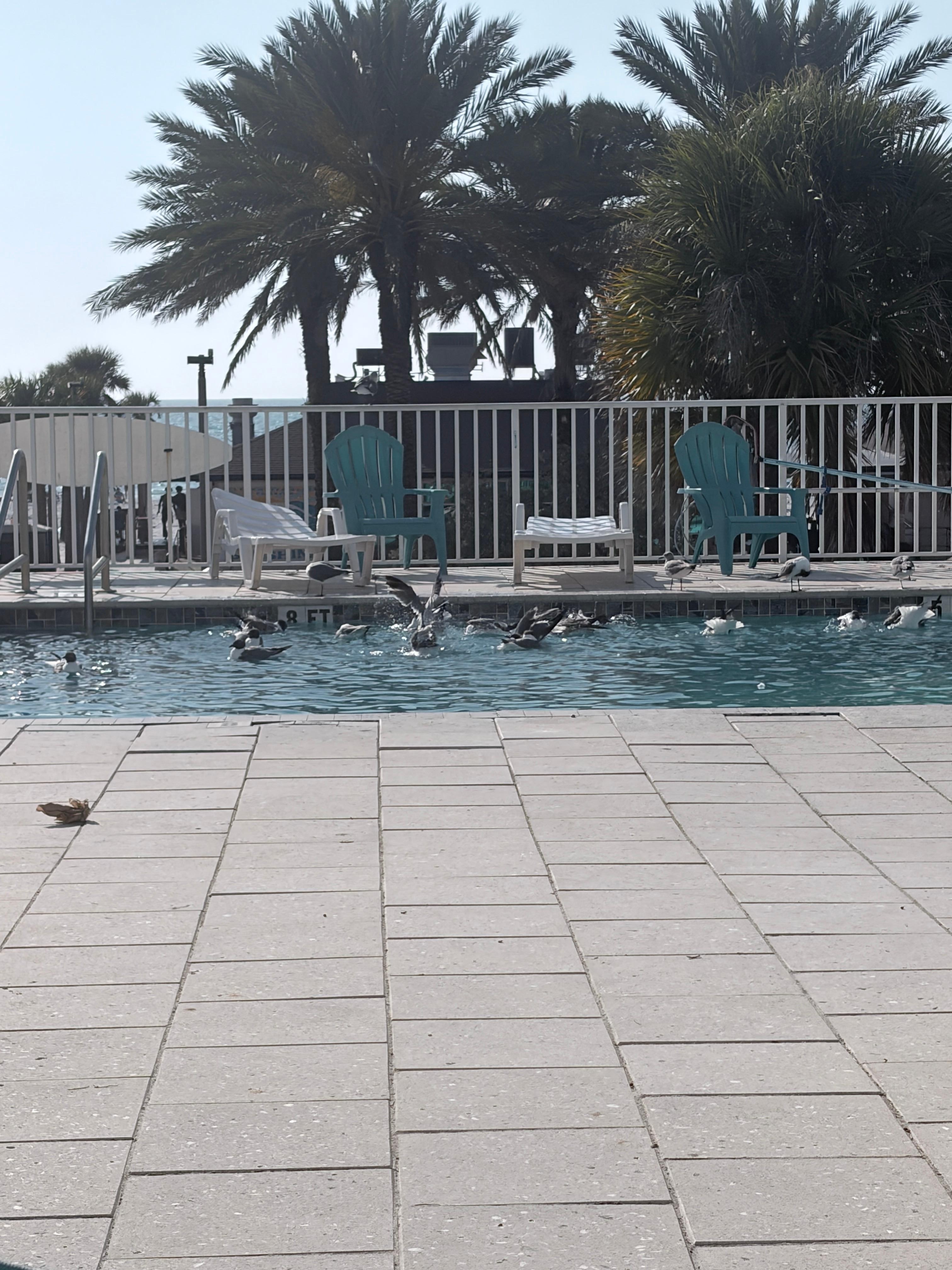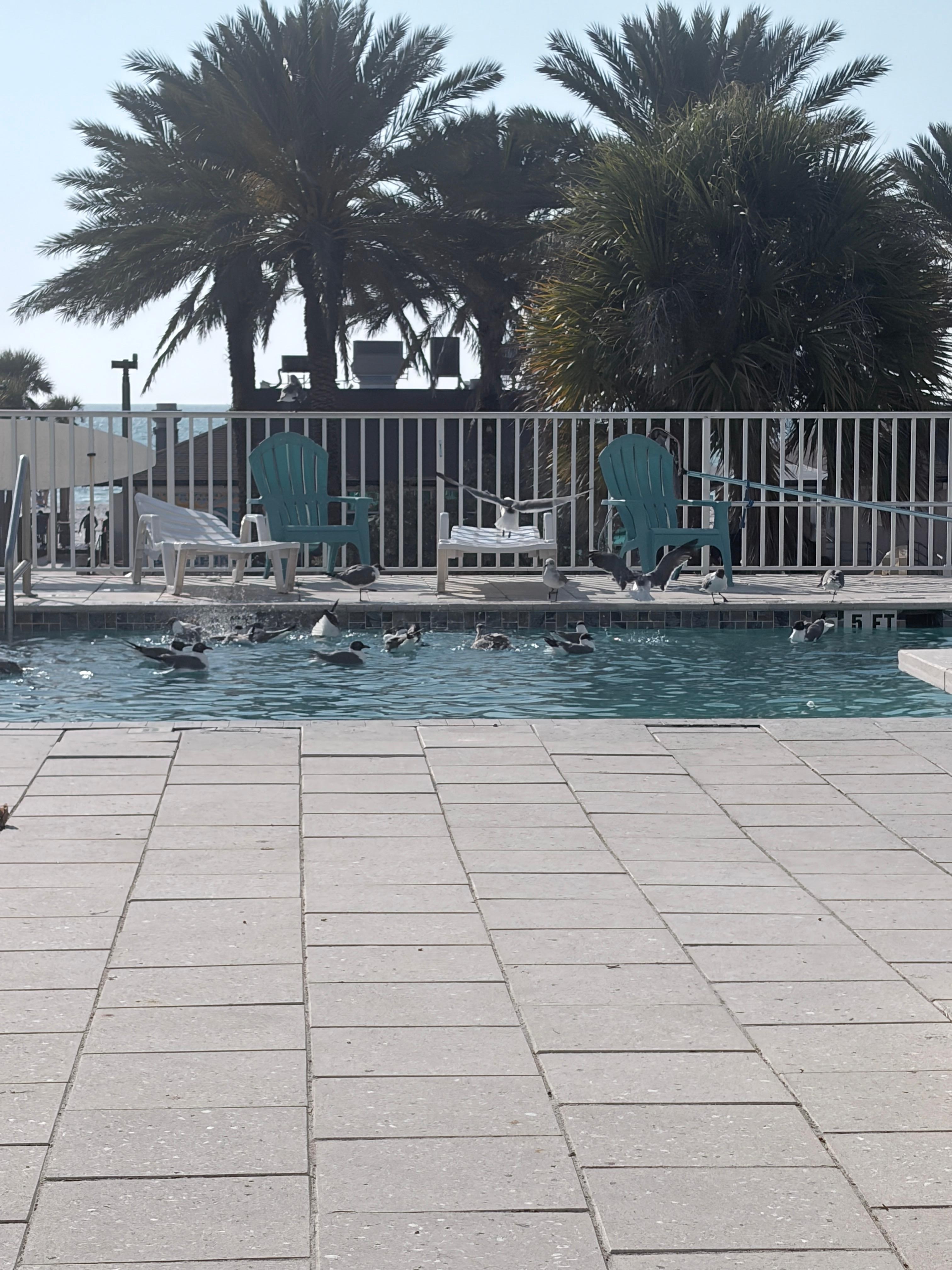 Cant swim in the pool because it is overrun by seaguls.
