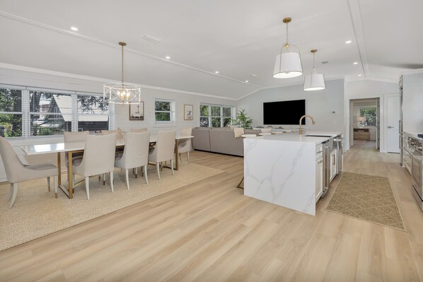 The top floor layout maximizes both form and function, featuring an open-concept design that encourages both relaxation and socializing. The large kitchen comes fully equipped with modern appliances and plenty of counter space, including a statement waterfall kitchen island with seating for four. The formal dining area has a long table with comfortable seating for 8 - perfect for a family meal or for game night! The living room area has a comfy L-shaped couch and an oversized flat screen TV – perfect for movie nights. Enjoy your morning coffee on the large deck overlooking the beautiful landscaping.