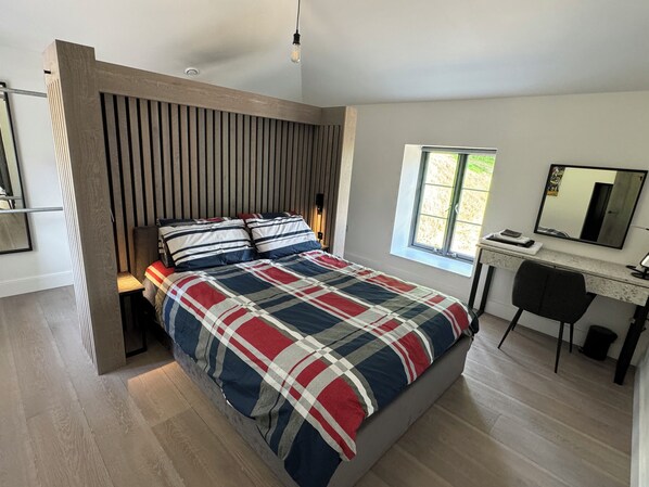 The Hayloft comprises three well-appointed bedrooms, each thoughtfully designed with ample wardrobe space and a dedicated workspace, accommodating a total of six guests. The master bedroom boasts an en-suite facility, king-size bed and is equipped with a 40-inch Smart TV for added convenience and entertainment. Additionally, the property offers a second full-sized bathroom, a fully furnished kitchen with modern amenities, and a spacious living area furnished with a 55-inch Smart TV for an enhanced guest experience.