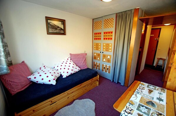 Fotogalleri för Yta: ca 16 m². 5: e våningen. Orientering: Norr. Vardagsrum med 2 utdragbara sängar